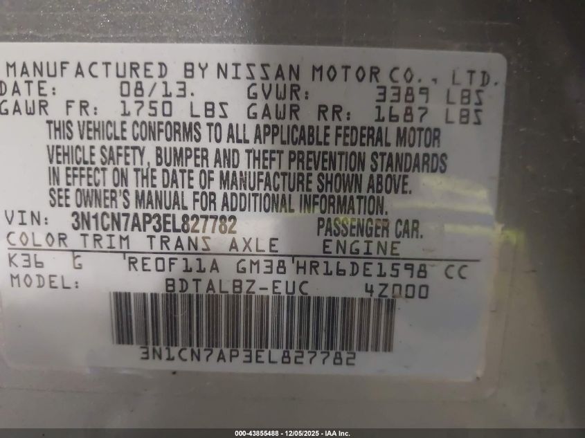 2014 NISSAN VERSA 2014 року Бензин, 1.6, Передній привід, vin - 3N1CN7AP3EL827782 з США