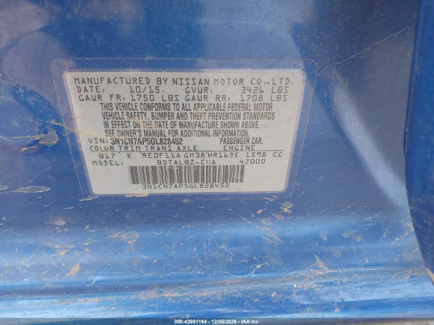 2016 NISSAN VERSA 2016 року Бензин, 1.6, Передній привід, vin - 3N1CN7AP5GL828452 з США