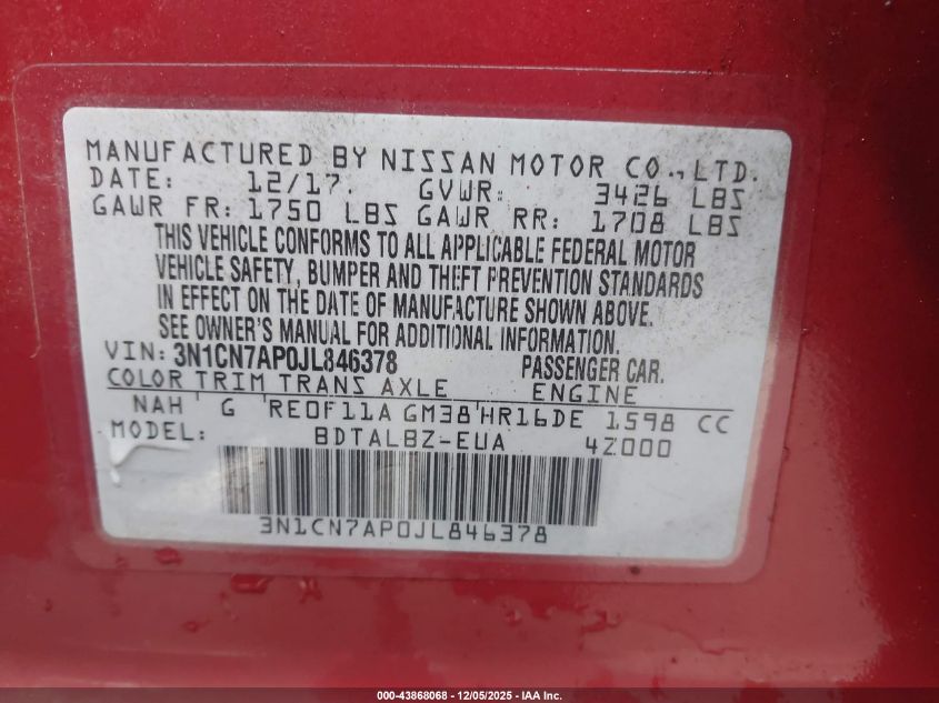 Колір ЧервонийЦиліндри 4Привід Передній привідVIN 3N1CN7AP0JL846378Стан Заводиться та їде (перевірено)Ушкодження Передня або задня AutoRIA