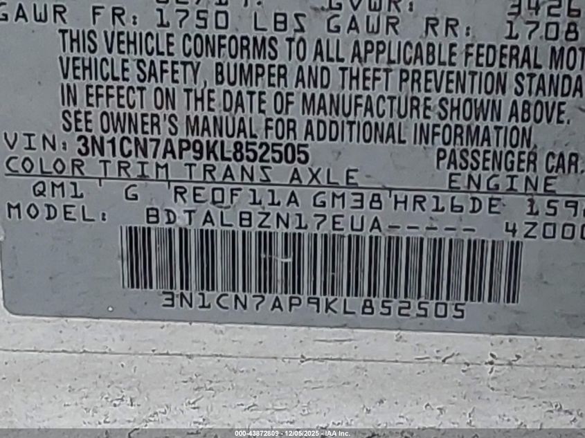 2019 NISSAN VERSA 2019 року Бензин, 1.6, Передній привід, vin - 3N1CN7AP9KL852505 з США