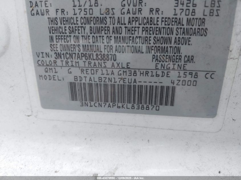 2019 NISSAN VERSA 2019 року Бензин, 1.6, Передній привід, vin - 3N1CN7AP6KL838870 з США