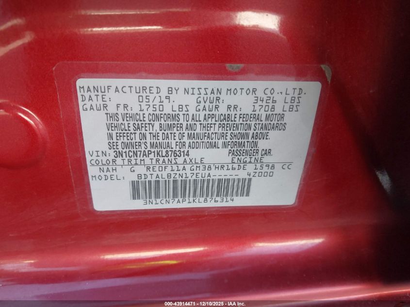 2019 NISSAN VERSA 2019 року Бензин, 1.6, Передній привід, vin - 3N1CN7AP1KL876314 з США
