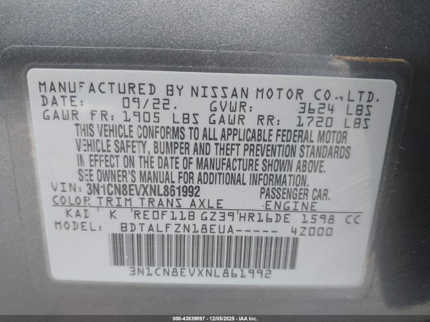 2022 NISSAN VERSA 2022 року Бензин, 1.6, Передній привід, vin - 3N1CN8EVXNL861992 з США