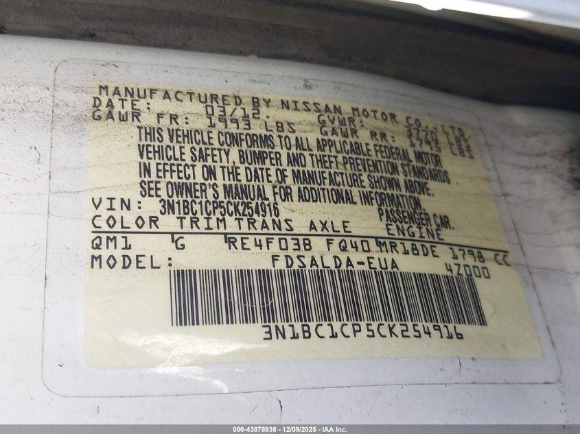 2012 NISSAN VERSA 2012 року Бензин, 1.8, Передній привід, vin - 3N1BC1CP5CK254916 з США