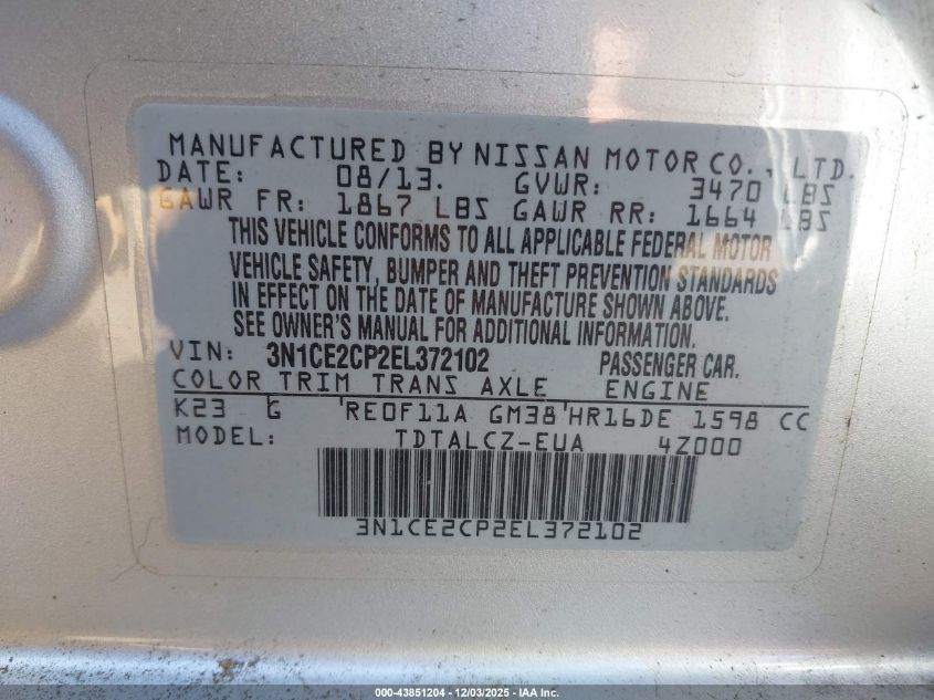 Колір СрібнийЦиліндри 4Привід Передній привідVIN 3N1CE2CP2EL372102Стан Заводиться та їде (перевірено)Ушкодження Задня ліваДата аукціону 2025-12-10 AutoRIA
