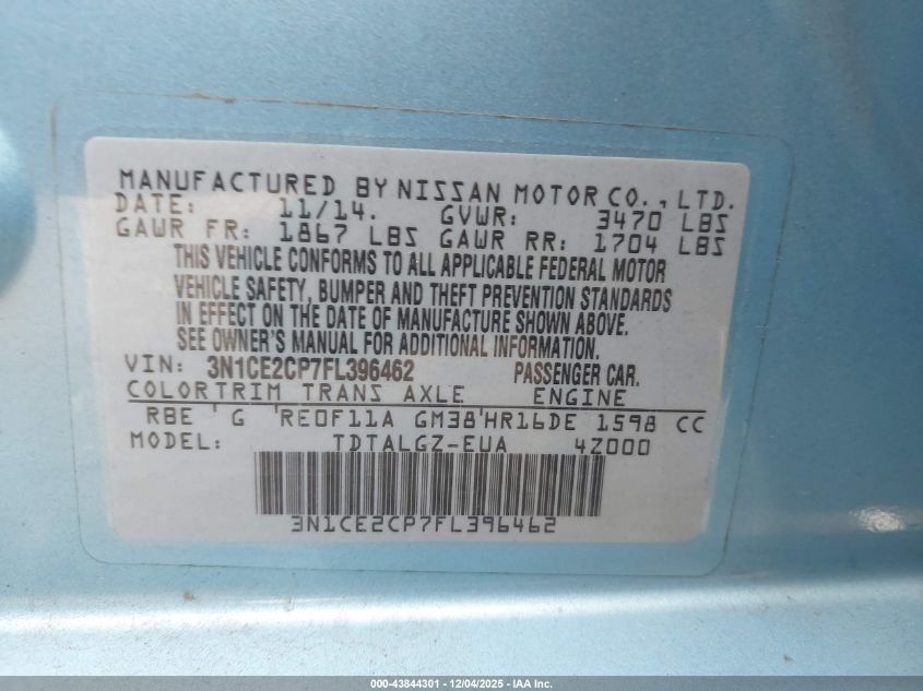 2015 NISSAN VERSA NOTE 2015 року Бензин, 1.6, Передній привід, vin - 3N1CE2CP7FL396462 з США