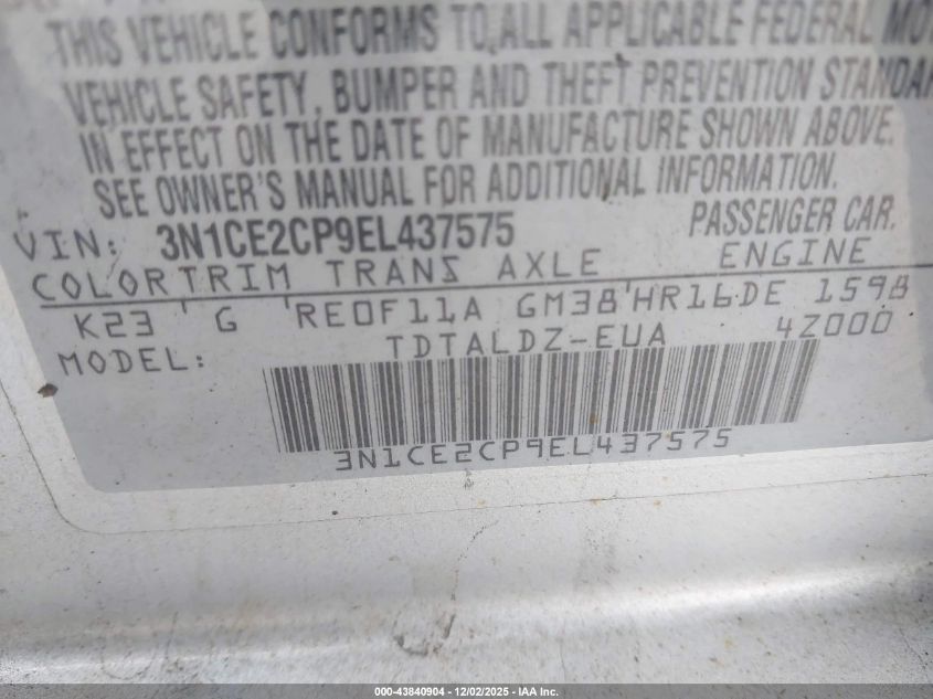 Колір СрібнийЦиліндри 4Привід Передній привідVIN 3N1CE2CP9EL437575Стан Заводиться та їде (перевірено)Ушкодження ЗадняДата аукціону 2025-12-10 AutoRIA