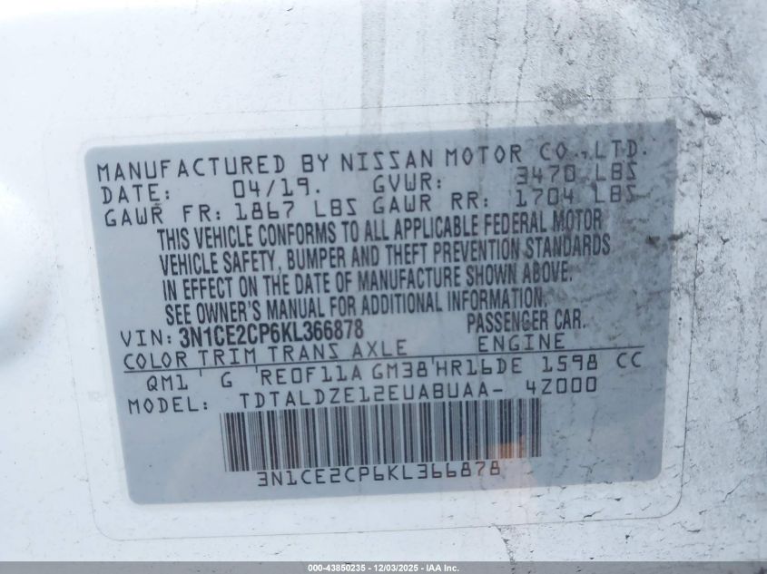 Колір БілийЦиліндри 4Привід Передній привідVIN 3N1CE2CP6KL366878Стан Заводиться та їде (перевірено)Ушкодження Передня ліваДата аукціону 2025-12-10 AutoRIA