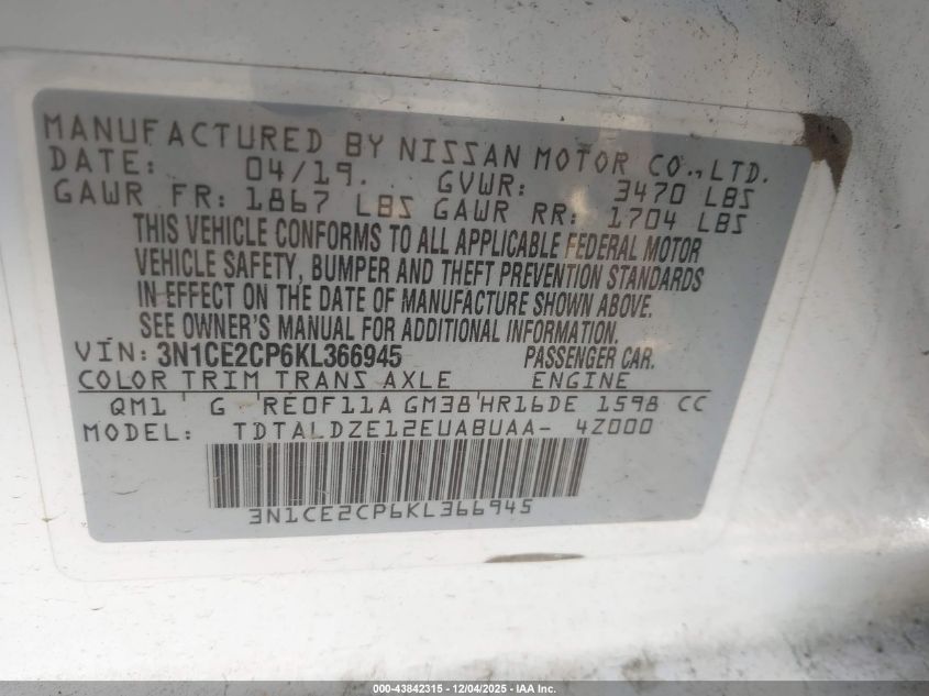 2019 NISSAN VERSA NOTE 2019 року Бензин, 1.6, Передній привід, vin - 3N1CE2CP6KL366945 з США
