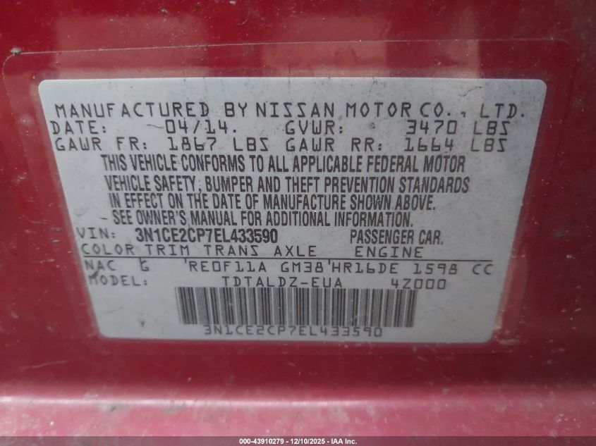 2014 NISSAN VERSA NOTE 2014 року Бензин, 1.6, Передній привід, vin - 3N1CE2CP7EL433590 з США