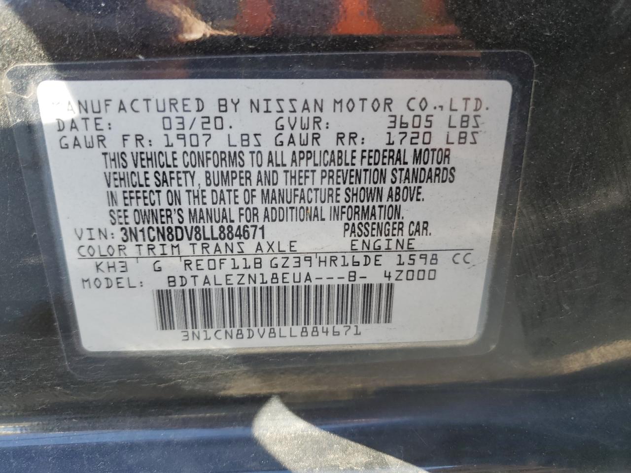 2020 NISSAN VERSA 2020 року Бензин, 1.6, , vin - 3N1CN8DV8LL884671 з США