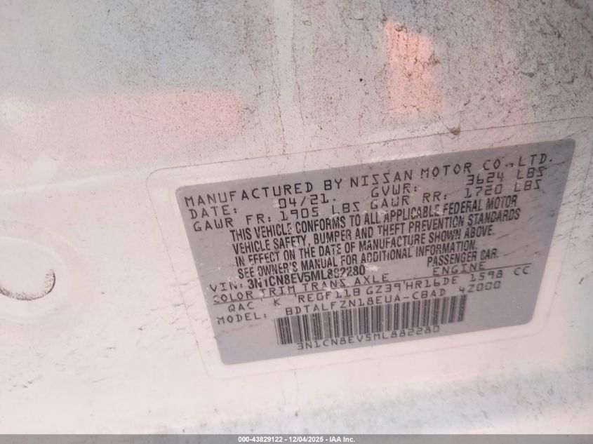 2021 NISSAN VERSA 2021 року Бензин, 1.6, Передній привід, vin - 3N1CN8EV5ML882280 з США