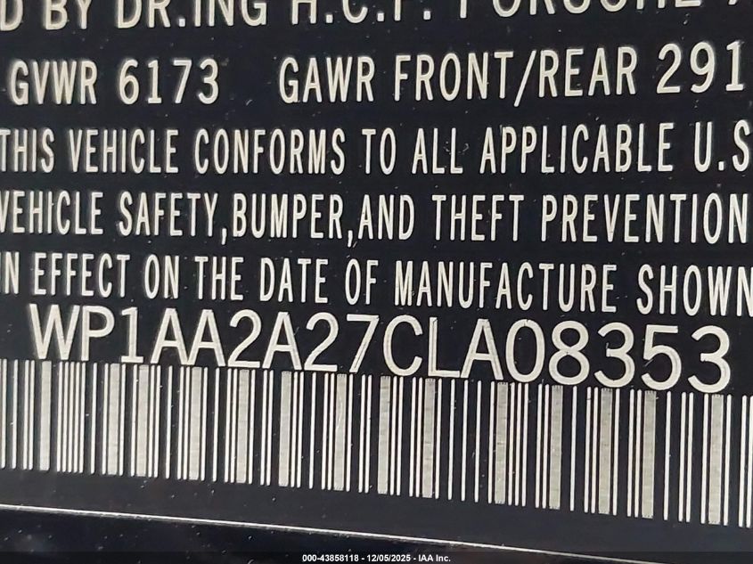 Колір ЧорнийЦиліндри 6Привід Повний привідVIN WP1AA2A27CLA08353Стан Заводиться та їде (перевірено)Ушкодження Передня або задня AutoRIA