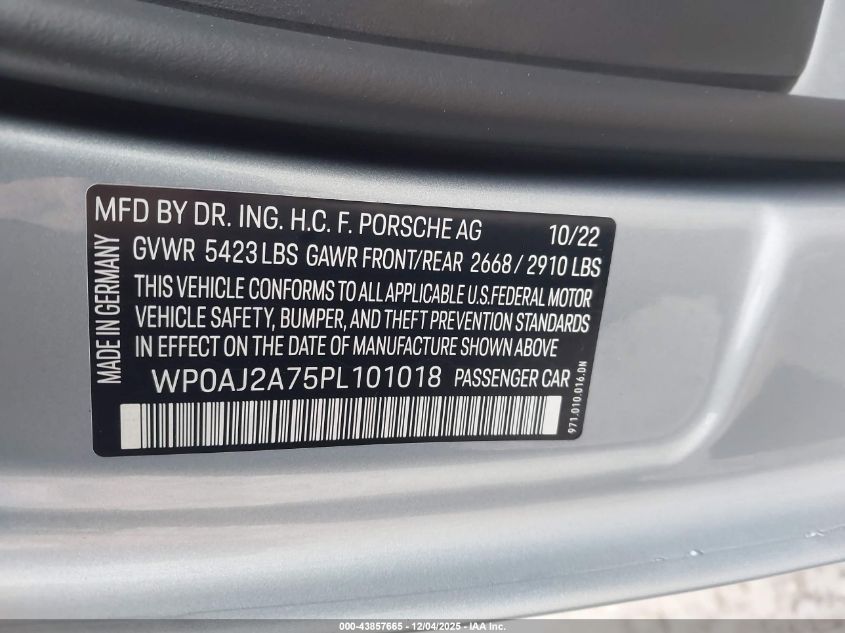 2023 PORSCHE PANAMERA 2023 року Бензин, 2.9, Задній привід, vin - WP0AJ2A75PL101018 з США