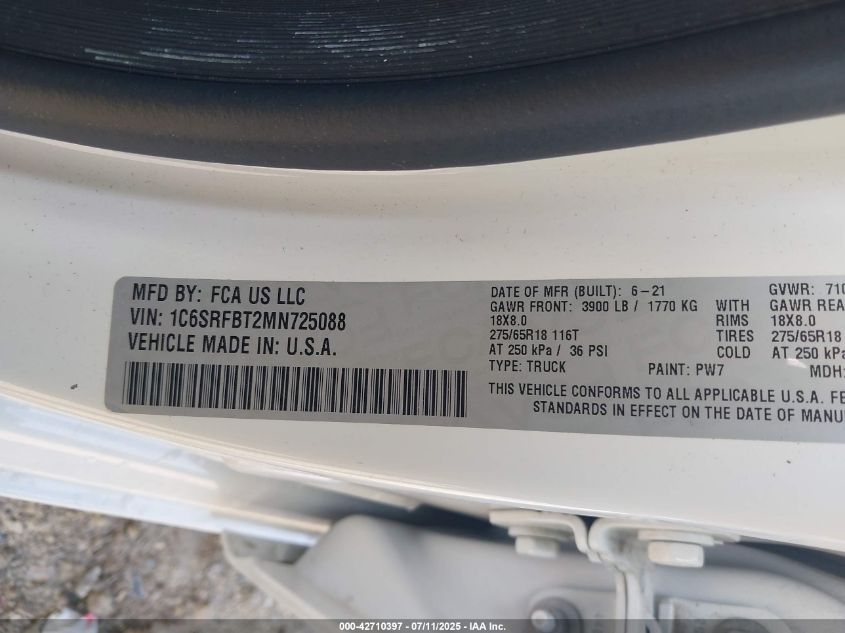 2021 RAM 1500 2021 року Бензин, 5.7, Повний привід, vin - 1C6SRFBT2MN725088 з США
