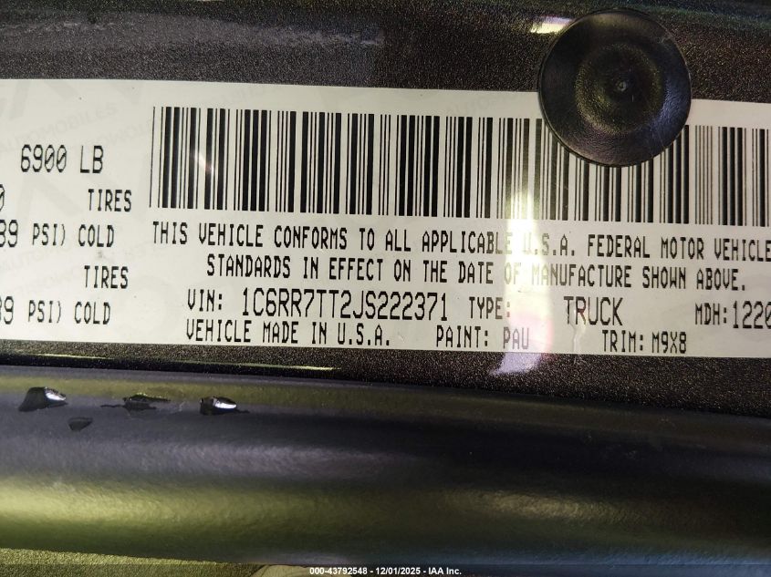 Колір СірийЦиліндри 8Привід Повний привідVIN 1C6RR7TT2JS222371Стан ЗаводитьсяУшкодження Передня або задня AutoRIA