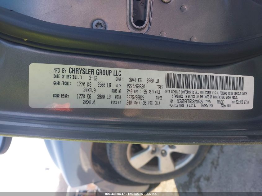 Колір СірийЦиліндри 8Привід Повний привідVIN 1C6RD7FT6CS248727Стан ЗаводитьсяУшкодження Задня