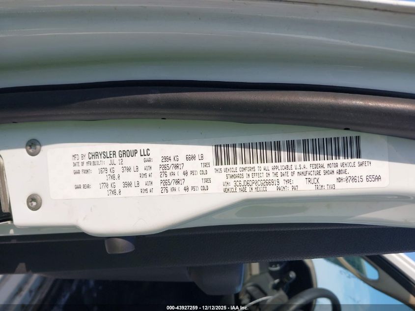 Колір БілийЦиліндри 8VIN 3C6JD6DP0CG266919Стан Заводиться та їде (перевірено)Ушкодження Передня праваДата аукціону 2025-12-17
