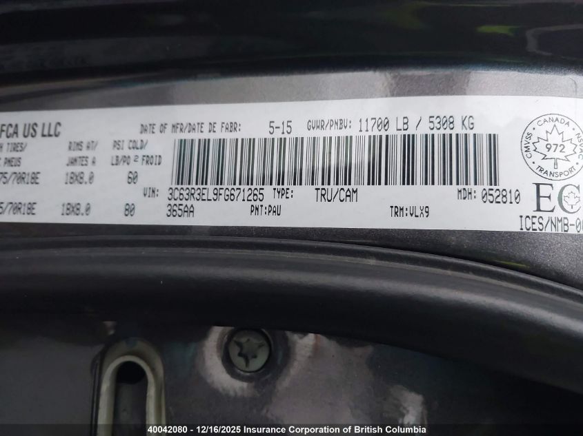 Колір СірийЦиліндри 6Привід Повний привідVIN 3C63R3EL9FG671265Стан СтаціонарноУшкодження ПередняДата аукціону 2025-12-19