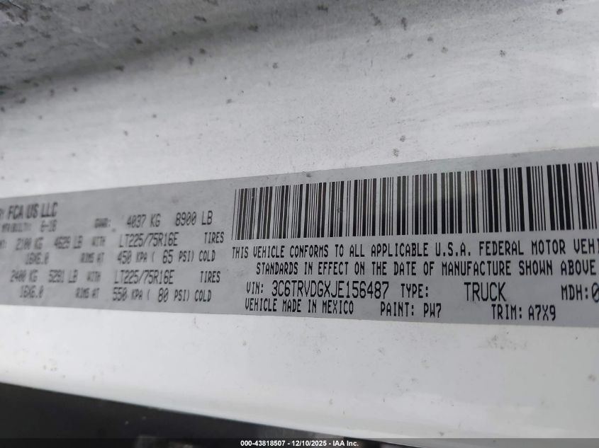 Колір БілийЦиліндри 6Привід Передній привідVIN 3C6TRVDGXJE156487Стан СтаціонарноУшкодження Передня або задня