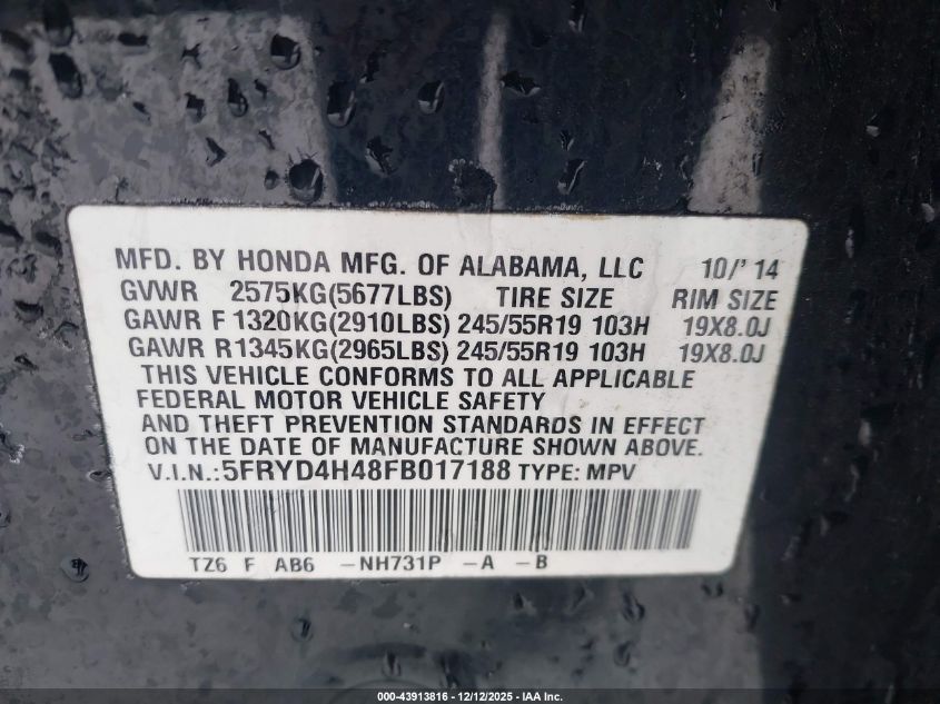 Цвет ЧерныйЦилиндры 6Привод Полный приводVIN 5FRYD4H48FB017188Состояние СтационарноПовреждения Правая сторона AutoRIA