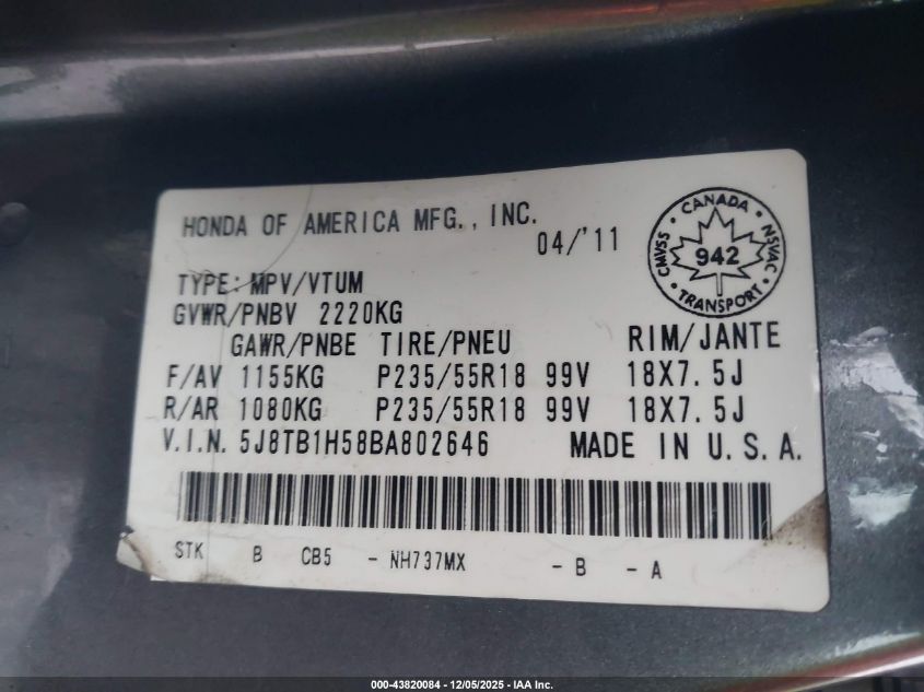 2011 ACURA RDX 2011 року Бензин, 2.3, Полный привод, vin - 5J8TB1H58BA802646 из США