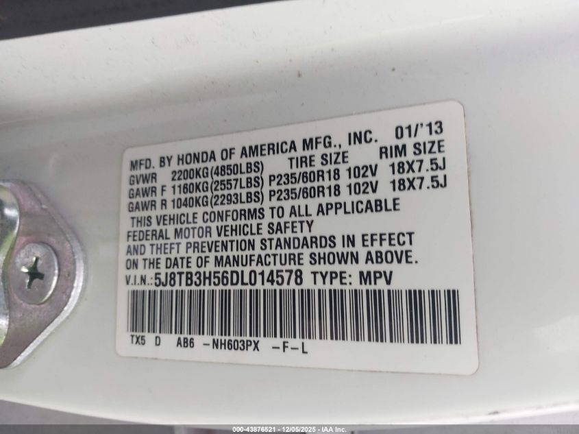 Цвет БелыйЦилиндры 6Привод Передний приводVIN 5J8TB3H56DL014578Состояние СтационарноПовреждения Задняя AutoRIA