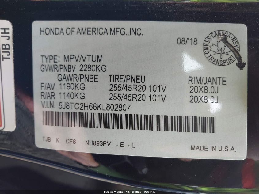 2019 ACURA RDX 2019 року Бензин, 2.0, Полный привод, vin - 5J8TC2H66KL802807 из США