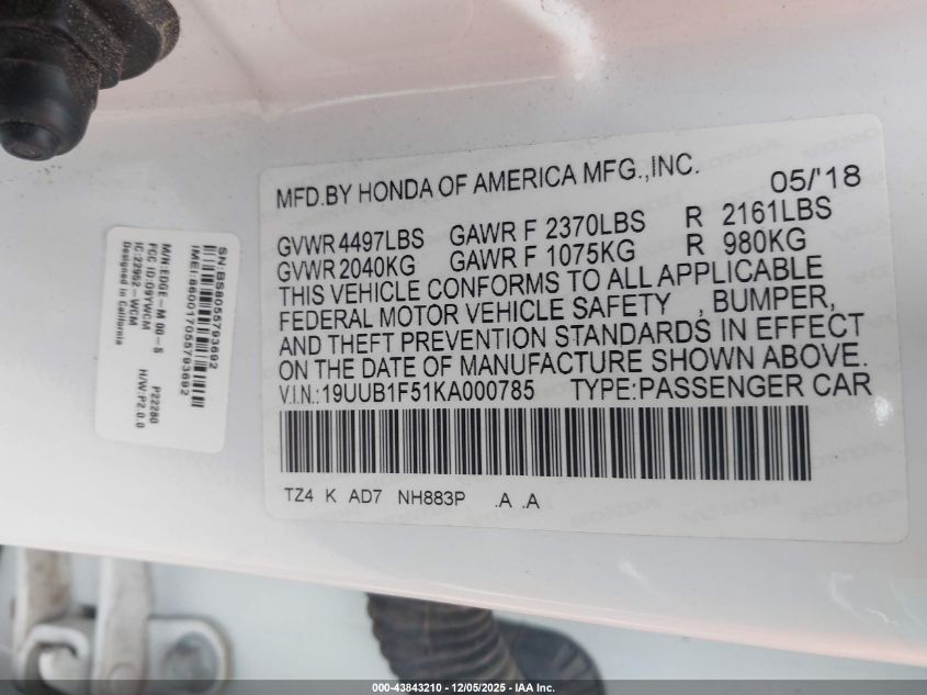 Цвет БелыйЦилиндры 4Привод Передний приводVIN 19UUB1F51KA000785Состояние Заводится и едет (проверено)Повреждения Передняя или задняя AutoRIA
