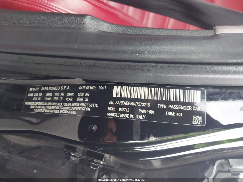 2018 ALFA ROMEO GIULIA 2018 року Бензин, 2.0, Полный привод, vin - ZARFAEEN4J7573216 из США