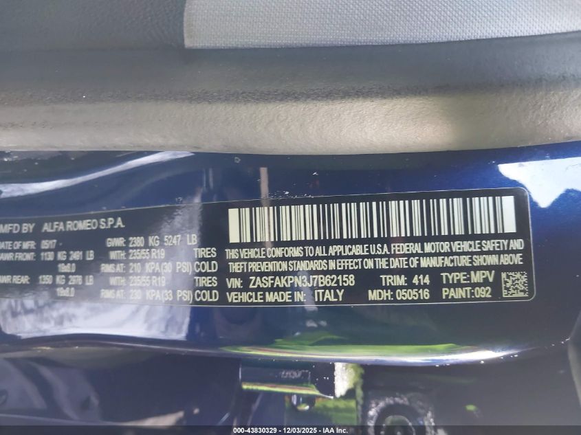 2018 ALFA ROMEO STELVIO 2018 року Бензин, 2.0, Полный привод, vin - ZASFAKPN3J7B62158 из США