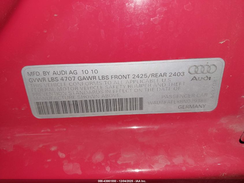 2011 AUDI A4 2011 року Бензин, 2.0, Передний привод, vin - WAUAFAFL8BN029386 из США