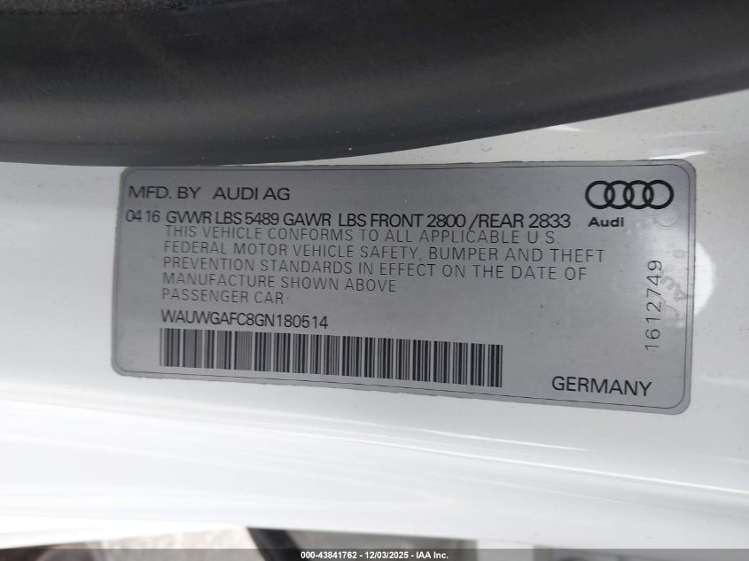 2016 AUDI A7 2016 року Бензин, 3.0, Полный привод, vin - WAUWGAFC8GN180514 из США