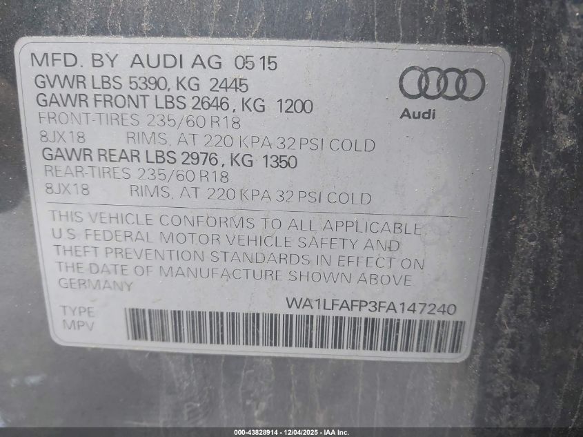 2015 AUDI Q5 2015 року Бензин, 2.0, Полный привод, vin - WA1LFAFP3FA147240 из США