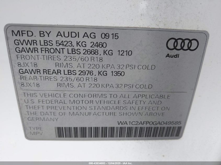 2016 AUDI Q5 2016 року Бензин, 2.0, Полный привод, vin - WA1C2AFP0GA049585 из США