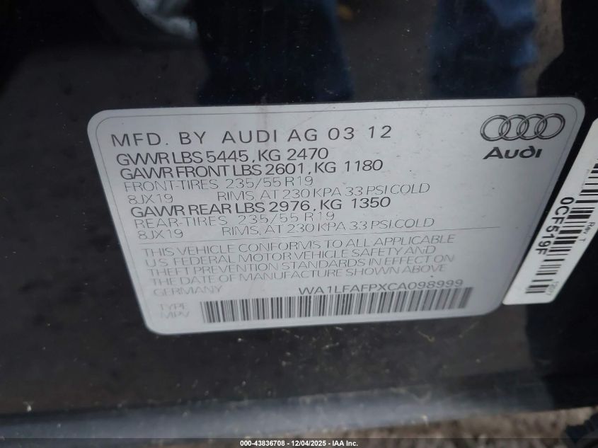 2012 AUDI Q5 2012 року Бензин, 2.0, Полный привод, vin - WA1LFAFPXCA098999 из США