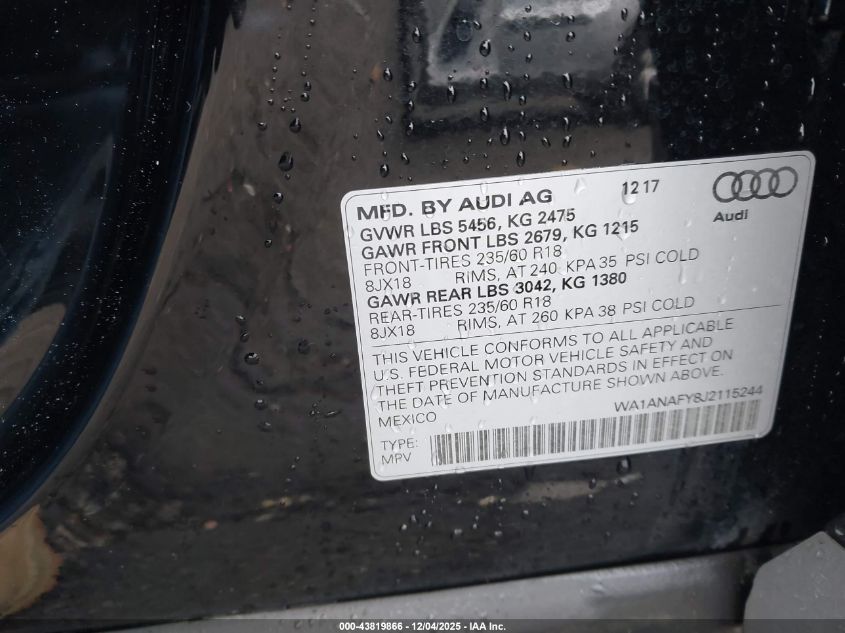 2018 AUDI Q5 2018 року Бензин, 2.0, Полный привод, vin - WA1ANAFY8J2115244 из США