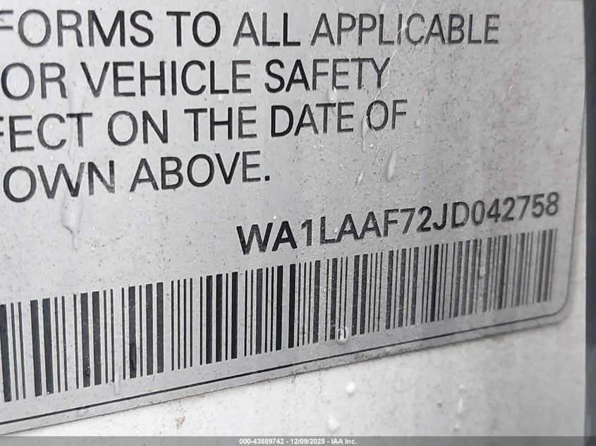 Цвет БелыйЦилиндры 6Привод Полный приводVIN WA1LAAF72JD042758Состояние Заводится и едет (проверено)Повреждения Передняя правая AutoRIA