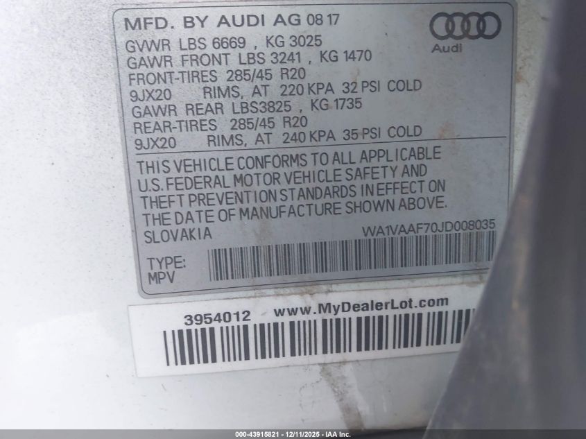 Цвет БелыйЦилиндры 6Привод Полный приводVIN WA1VAAF70JD008035Состояние Заводится и едет (проверено)Повреждения Передняя или задняя AutoRIA
