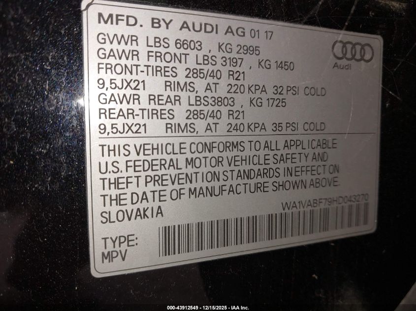 Цвет ЧерныйЦилиндры 6Привод Полный приводVIN WA1VABF79HD043270Состояние СтационарноПовреждения Неизвестно AutoRIA