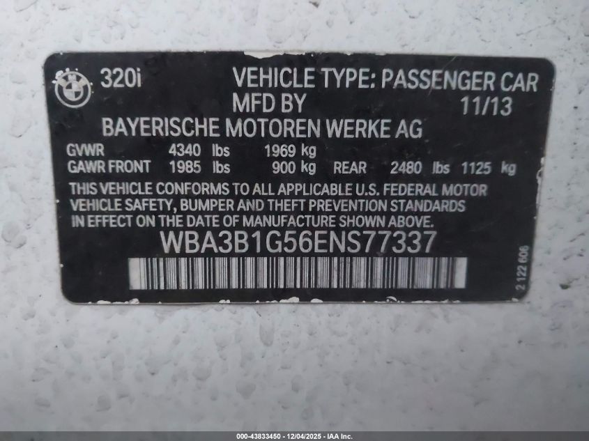 2014 BMW 3 SERIES 2014 року Бензин, 2.0, Задний привод, vin - WBA3B1G56ENS77337 из США