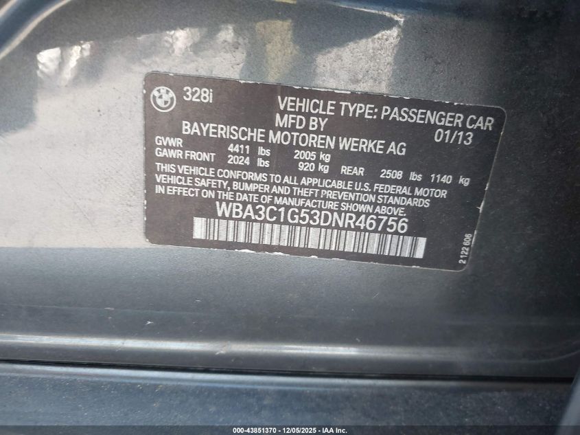 2013 BMW 3 SERIES 2013 року Бензин, 2.0, Задний привод, vin - WBA3C1G53DNR46756 из США