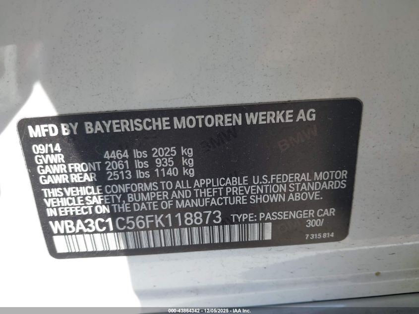 2015 BMW 3 SERIES 2015 року Бензин, 2.0, Задний привод, vin - WBA3C1C56FK118873 из США
