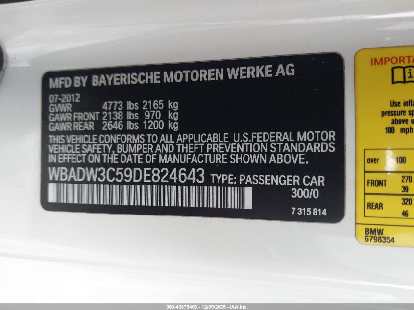 2013 BMW 3 SERIES 2013 року Бензин, 3.0, Задний привод, vin - WBADW3C59DE824643 из США