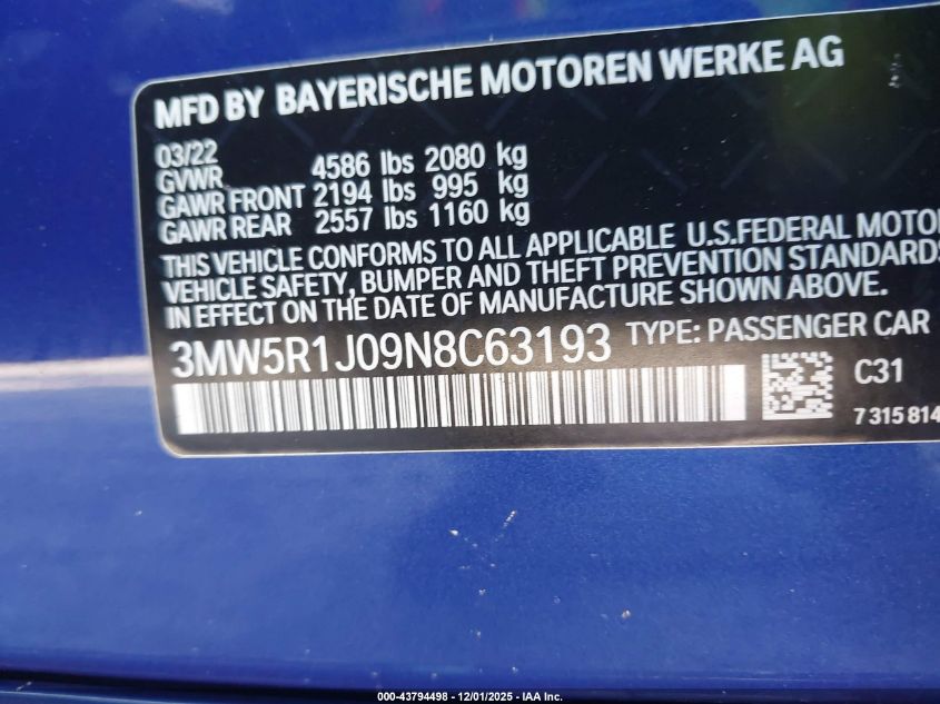 2022 BMW 3 SERIES 2022 року Бензин, 2.0, Задний привод, vin - 3MW5R1J09N8C63193 из США