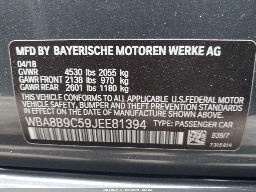 2018 BMW 3 SERIES 2018 року Бензин, 2.0, Задний привод, vin - WBA8B9C59JEE81394 из США