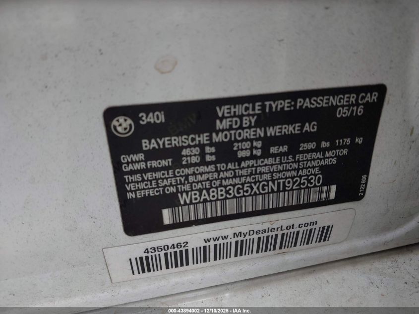 2016 BMW 3 SERIES 2016 року Бензин, 3.0, Задний привод, vin - WBA8B3G5XGNT92530 из США