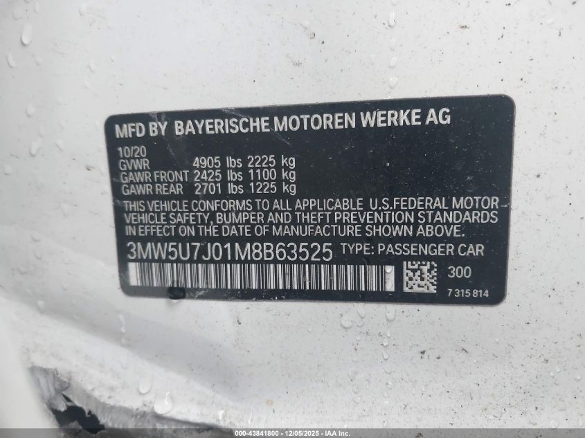 2021 BMW 3 SERIES 2021 року Бензин, 3.0, Задний привод, vin - 3MW5U7J01M8B63525 из США