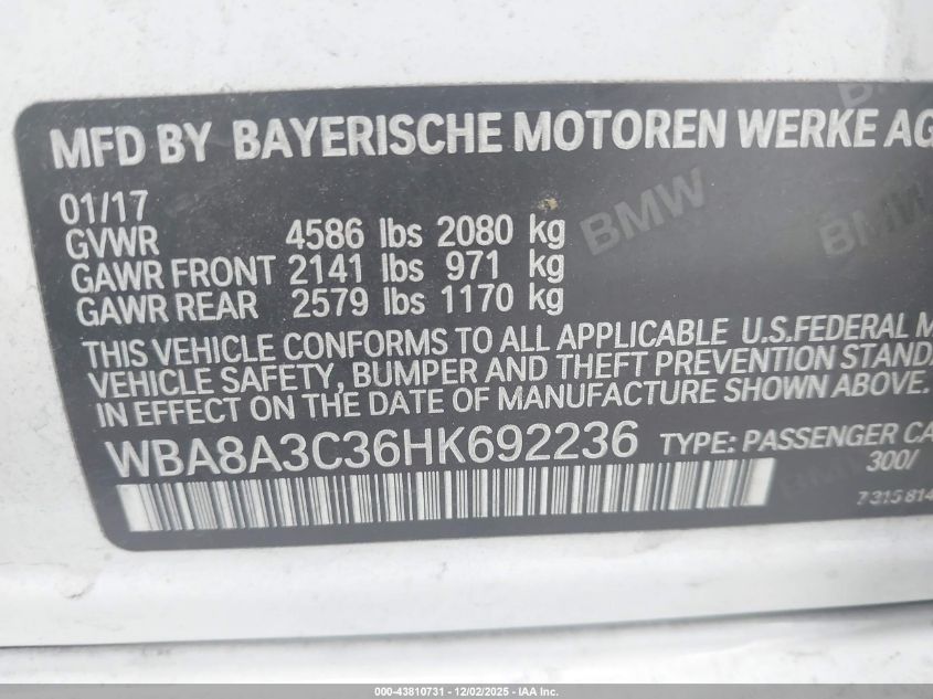 2017 BMW 3 SERIES 2017 року Бензин, 2.0, Полный привод, vin - WBA8A3C36HK692236 из США