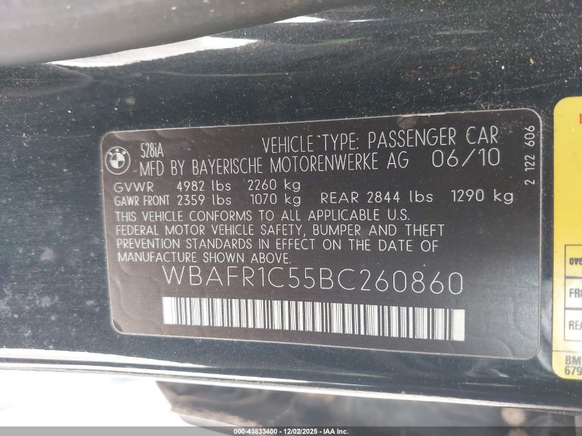 2011 BMW 5 SERIES 2011 року Бензин, 3.0, Задний привод, vin - WBAFR1C55BC260860 из США